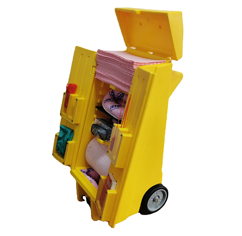 ● Wheeled assemblies containing treatment supplies and reference materials can be easily moved anywhere in the plant、allowing you to quickly bring absorbent materials to the spill site in a double-deck polyethylene trolley with adjustable shelves